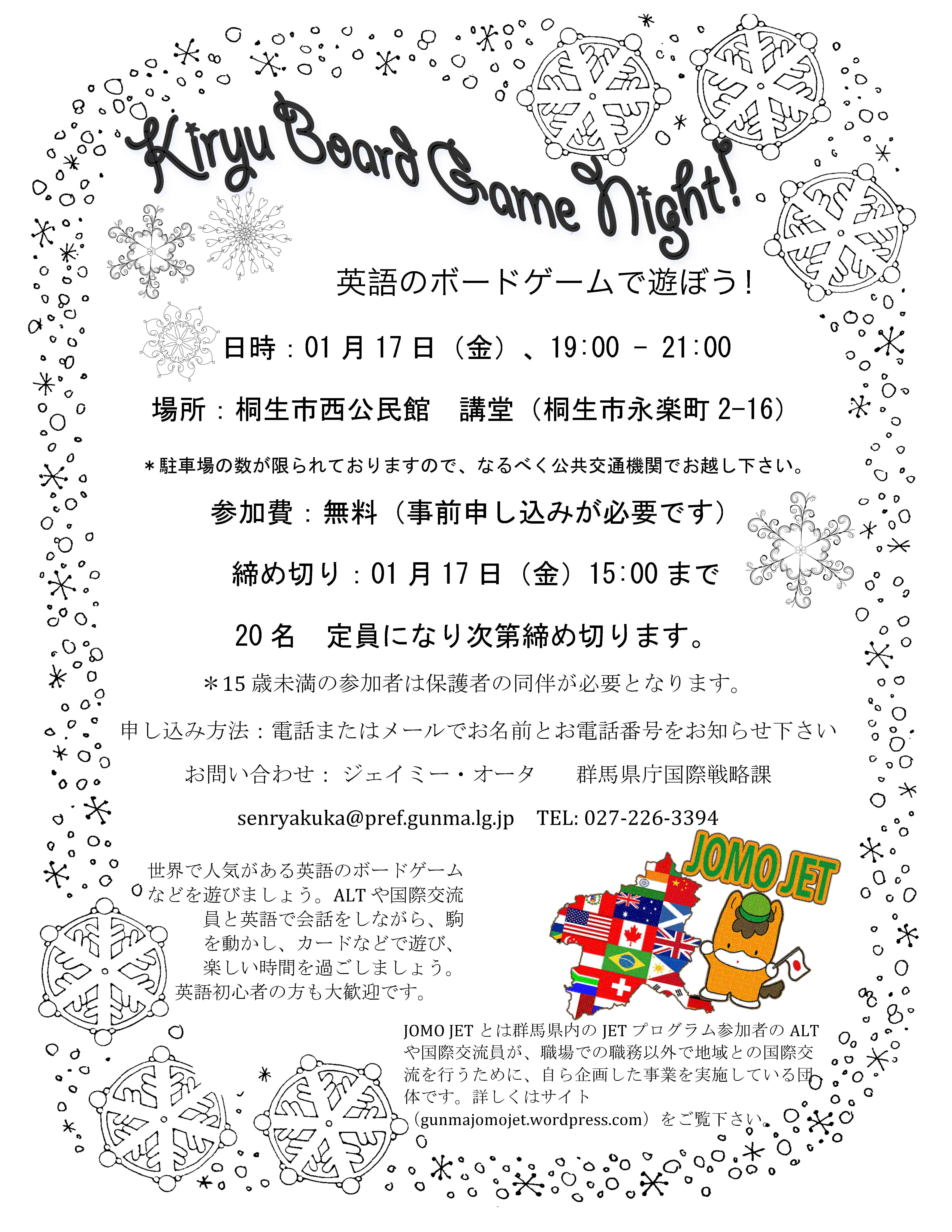 Kiryu Board Game Night (01/17) 開催のお知らせ!