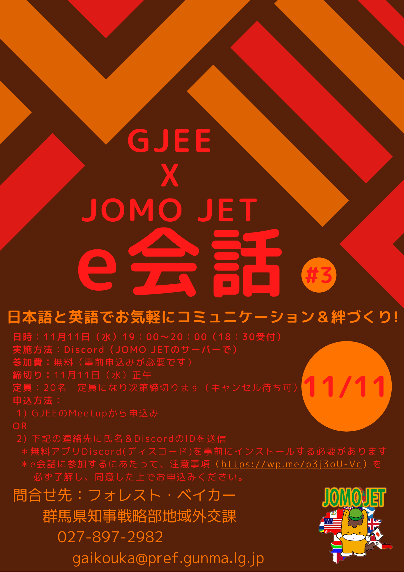赤城おろしが吹き、日一日と秋が深まっていくようですね。身心を温めたい時は、やはりオンライン和英言語交流に限るので、11月11日(水)「第3回e会話」を開催します!今回もGJEEと協力して、親しみやすいオンライン国際交流のイベントを提供します。