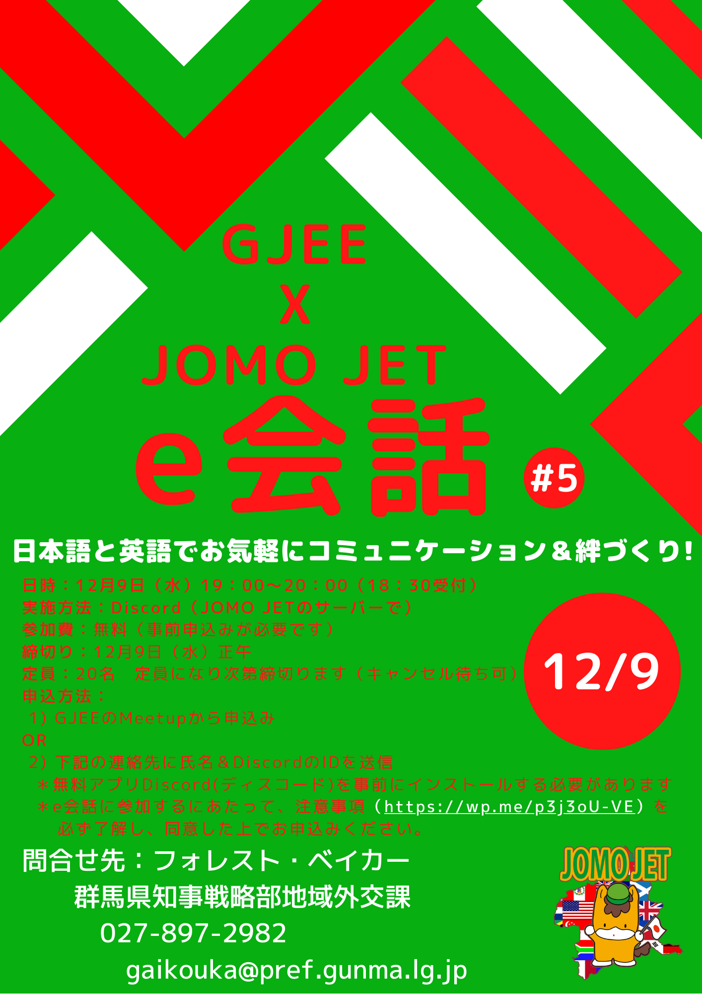 JOMO JET and GJEE will team up again to host this super simple online language exchange event. Groups of two English speakers and two Japanese speakers talk for 30 minutes in English and for 30 minutes in Japanese. Anyone can join regardless of language level, so we hope to see you there!