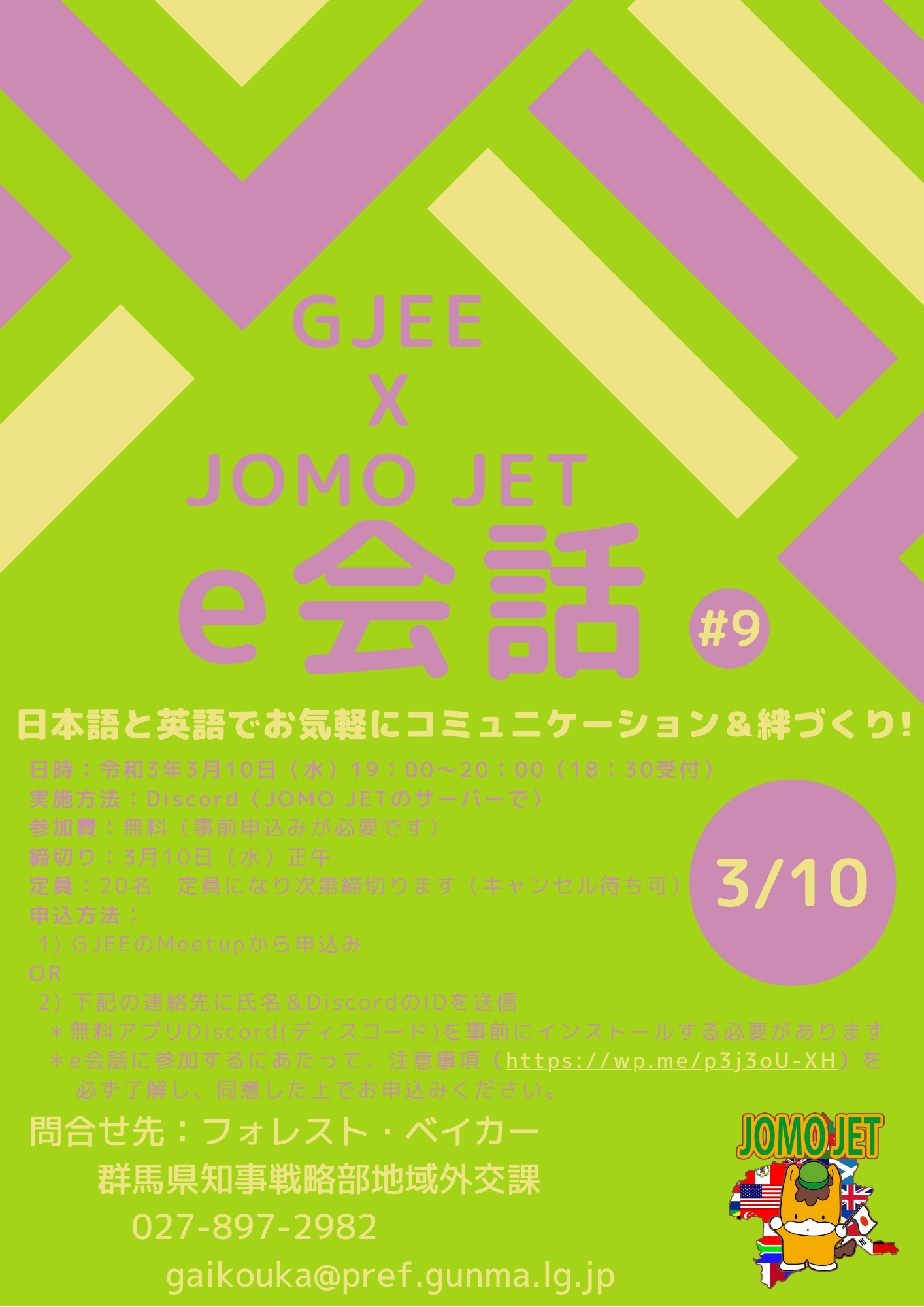 JOMO JET and GJEE will team up again to host this super simple online language exchange event. Groups of two English speakers and two Japanese speakers talk for 30 minutes in English and for 30 minutes in Japanese. Anyone can join regardless of language level, so we hope to see you there!