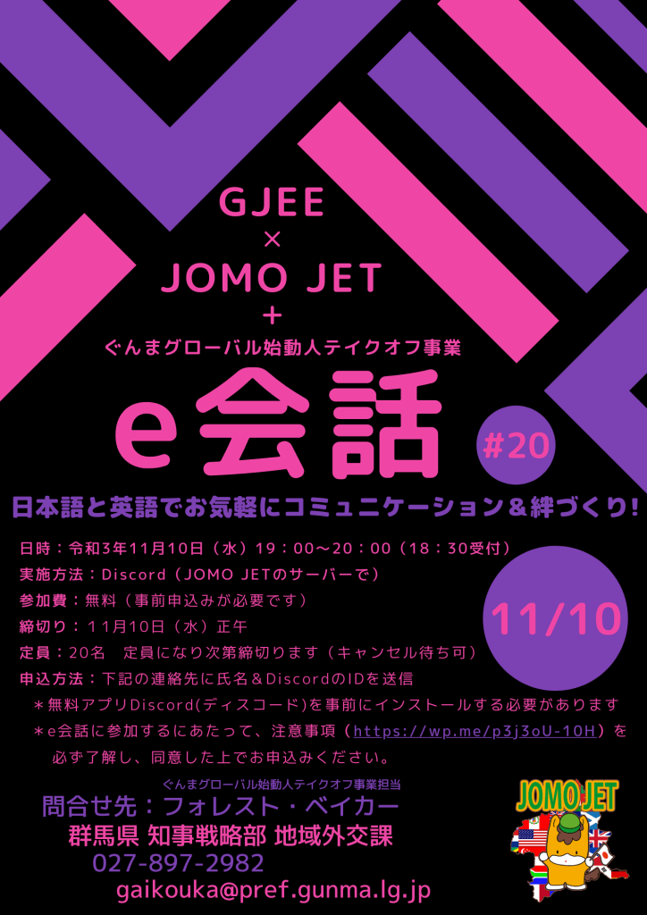 JOMO JET and GJEE will team up again to host this super simple online language exchange event. Groups of two English speakers and two Japanese speakers talk for 30 minutes in English and for 30 minutes in Japanese. Anyone can join regardless of language level, so we hope to see you there!