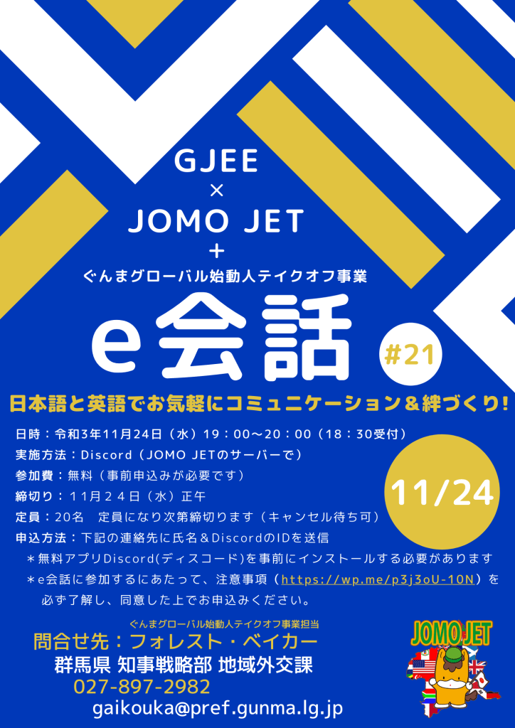 JOMO JET and GJEE will team up again to host this super simple online language exchange event. Groups of two English speakers and two Japanese speakers talk for 30 minutes in English and for 30 minutes in Japanese. Anyone can join regardless of language level, so we hope to see you there!