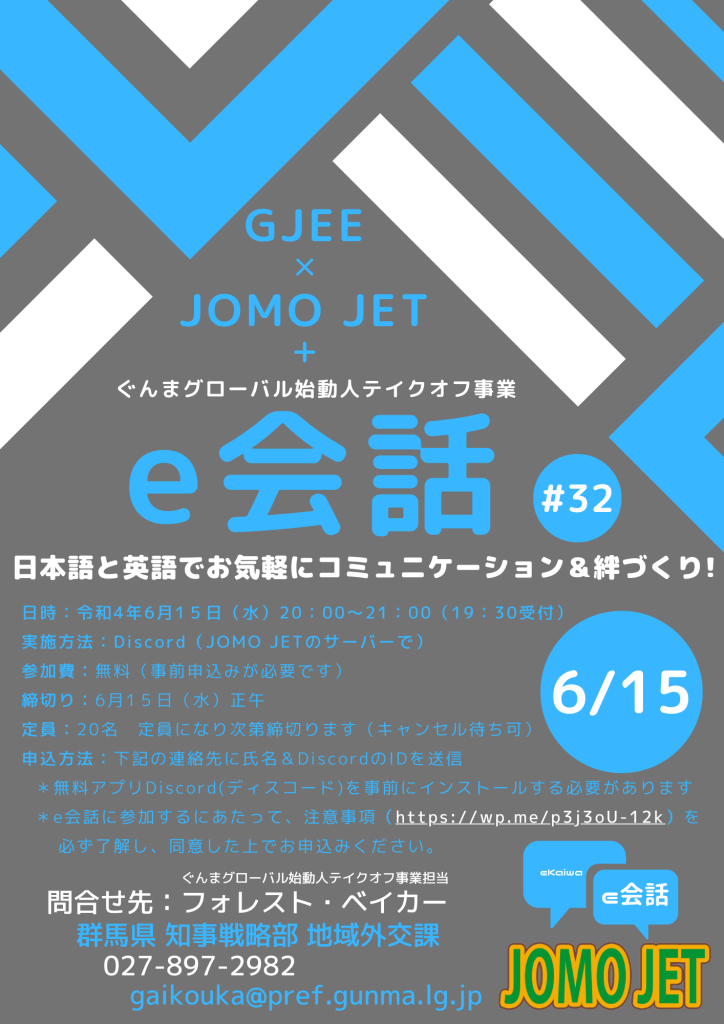 e-Kaiwa #32 will be held on Wednesday, June 15th from 20:00 to 21:00!