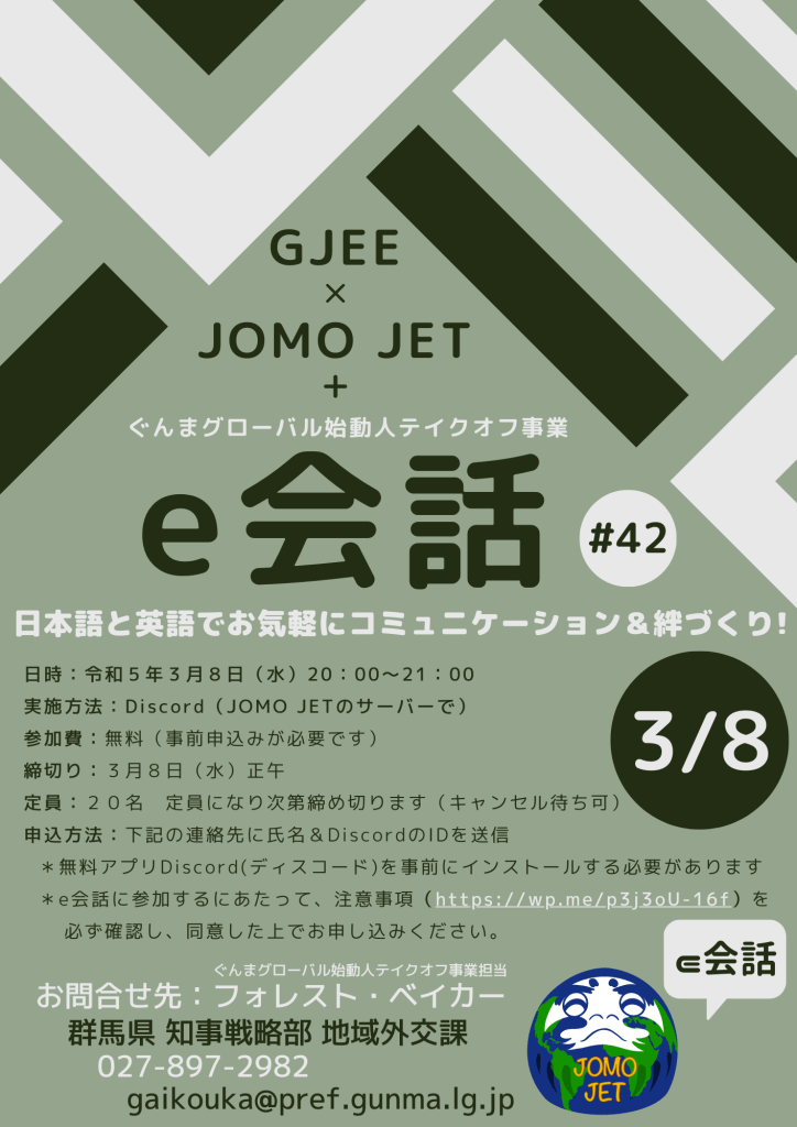 e-Kaiwa #42 will be held on Wednesday, March 8th from 20:00 to 21:00!