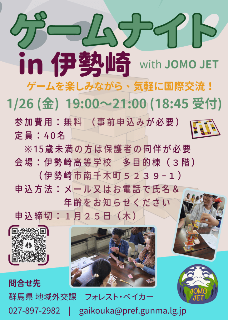 大人気国際交流イベント「JOMO JETゲームナイト」は今回、伊勢崎市で開催します!